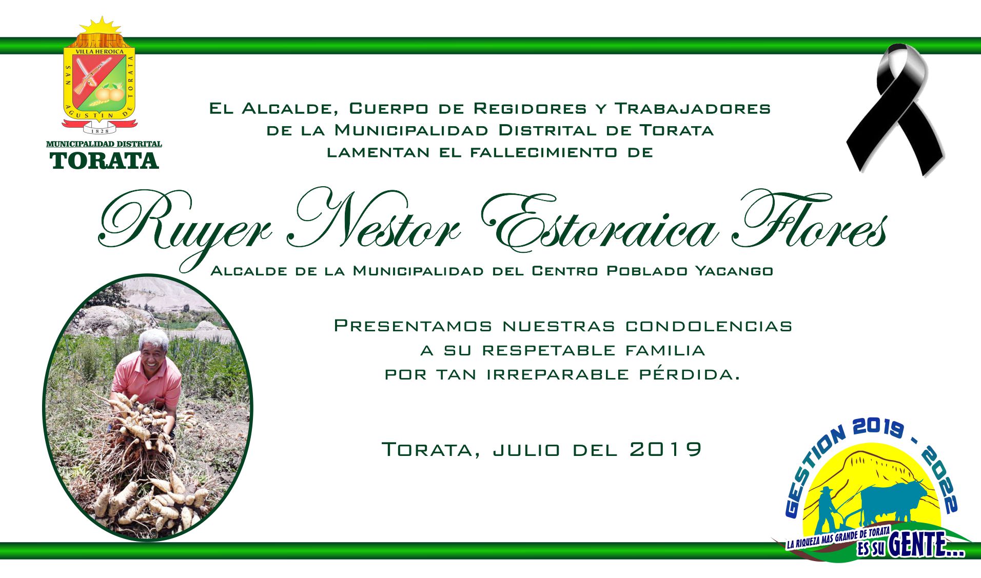 El Alcalde de Torata Hernán Juarez Coayla, Cuerpo de Regidores del Concejo Municipal y trabajadores de la Municipalidad de Torata expresamos nuestro más sentido pésame a la familia de un gran torateño que parte al lado del señor.