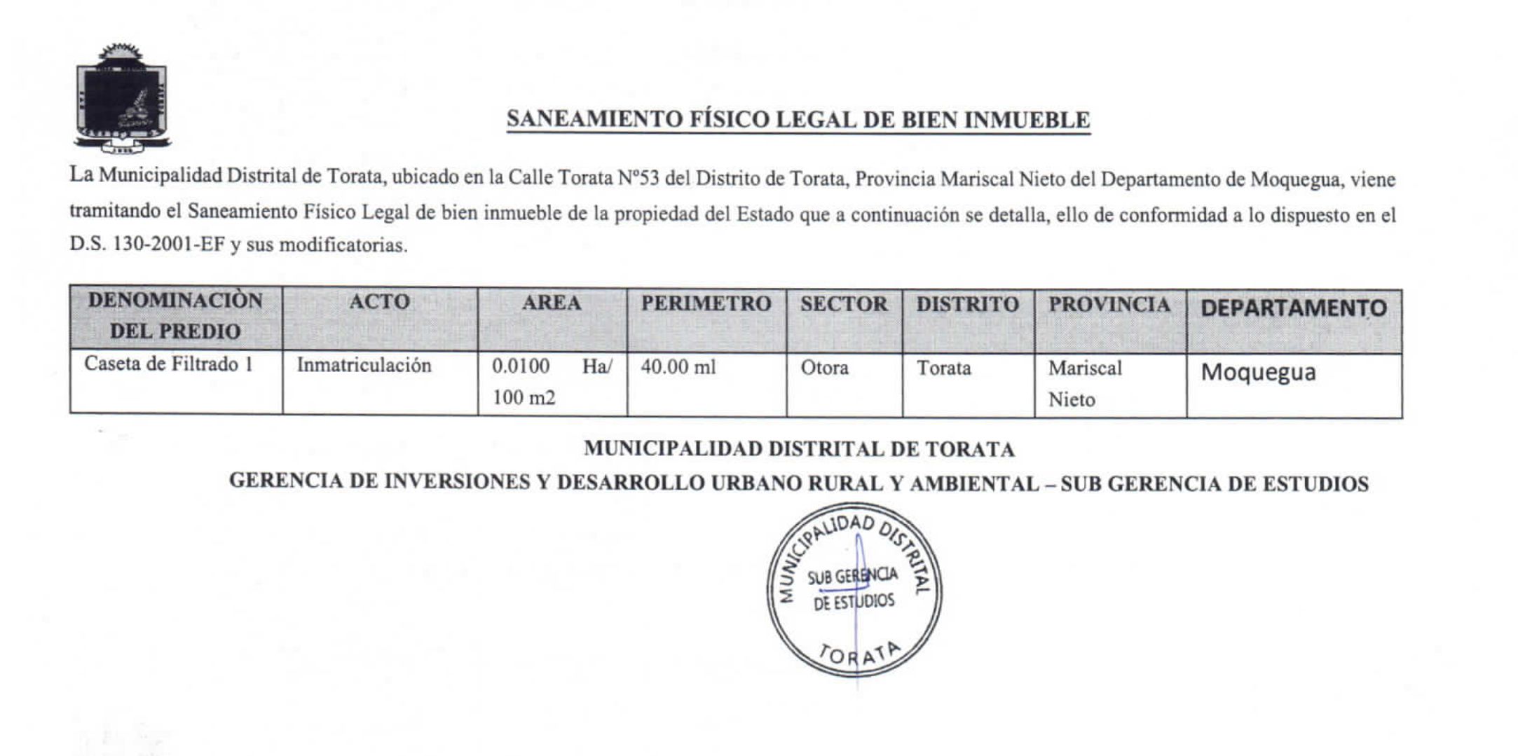 La Municipalidad Distrital de Torata, ubicado en la Calle Torata Nº53 – Plaza de Armas del Distrito de Torata, Provincia Mariscal Nieto del Departamento de Moquegua, viene tramitando el Saneamiento Físico Legal de bien inmueble de la propiedad del Estado que a continuación se detalla, ello de conformidad a lo dispuesto en el D.S. 130-2001-EF y sus modificatorias.
