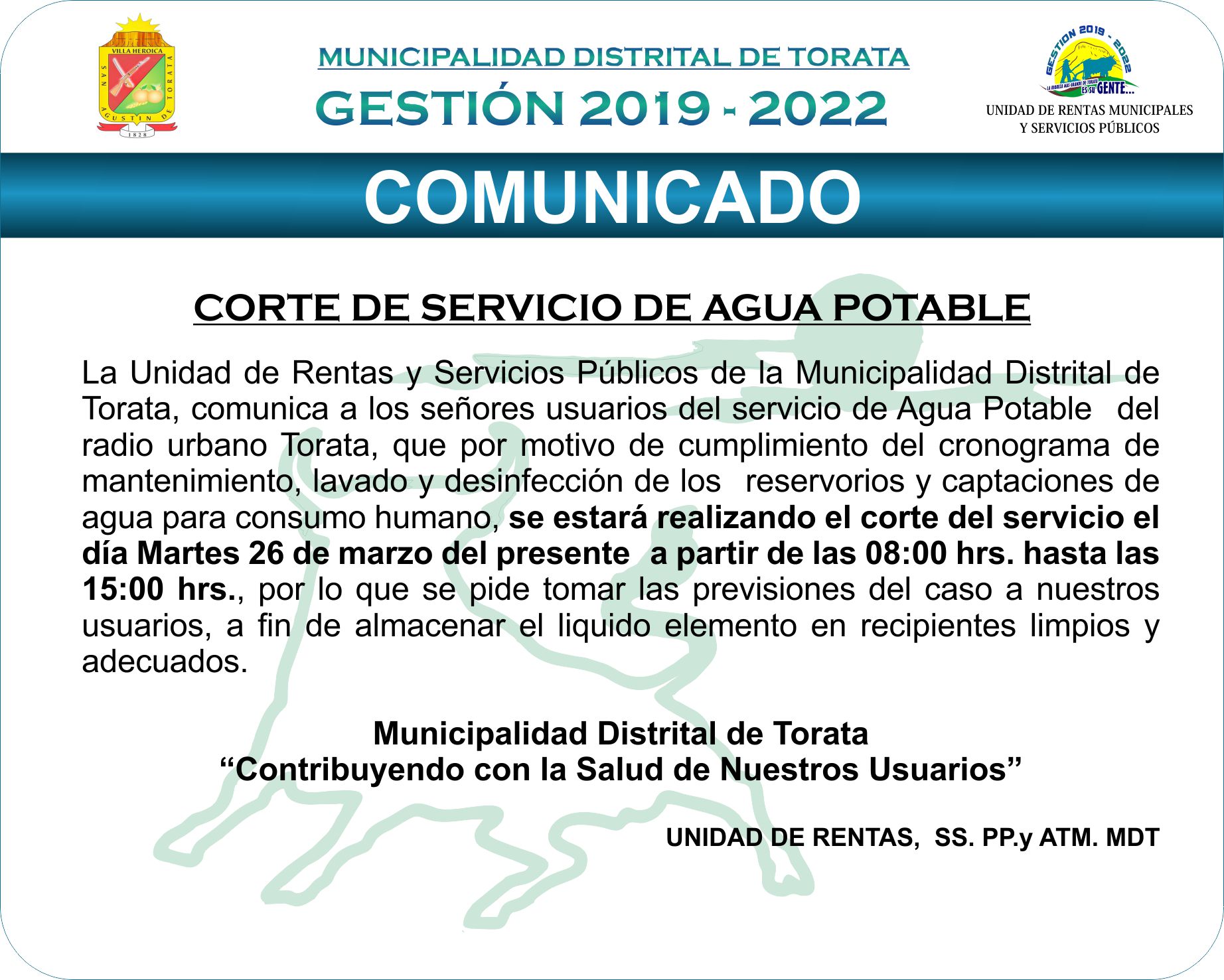 La Unidad de Rentas y Servicios Públicos de la Municipalidad Distrital de Torata, comunica a los señores usuarios del servicio de Agua Potable del Radio Urbano Torata, que por motivo de cumplimiento del cronograma de mantenimiento, lavado y desinfección de los reservorios y captaciones de agua para consumo humano, se estará realizando el corte del servicio el día Martes 26 de marzo del presente a partir de las 08:00 hrs. hasta las 15:00 hrs., por lo que se pide tomar las previsiones del caso a nuestros usuarios, a fin de almacenar el liquido elemento en recipientes limpios y adecuados.