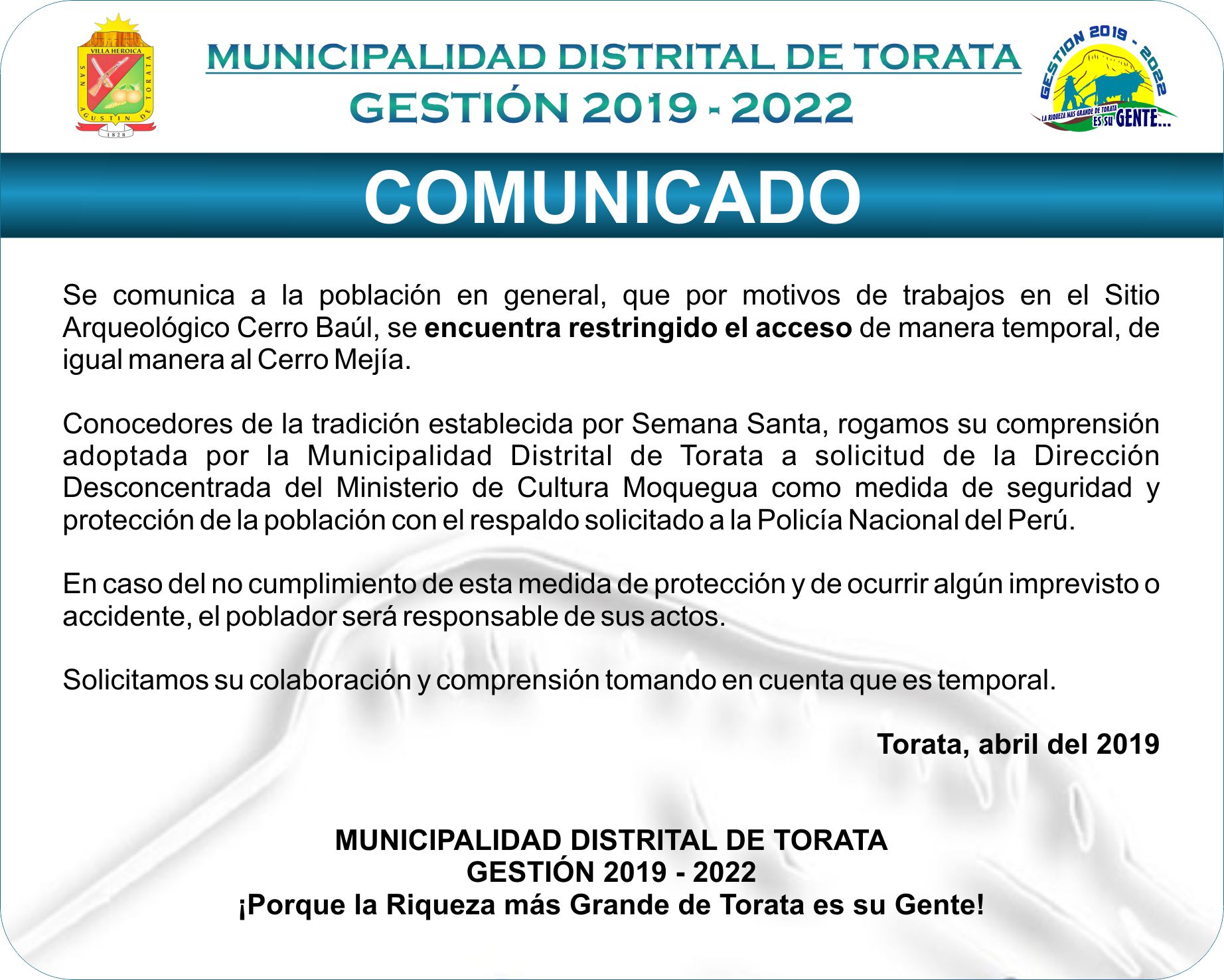 Conocedores de la tradición establecida por Semana Santa, rogamos su comprensión adoptada por la Municipalidad Distrital de Torata a solicitud de la Dirección Desconcentrada del Ministerio de Cultura Moquegua como medida de seguridad y protección de la población con el respaldo solicitado a la Policía Nacional del Perú.