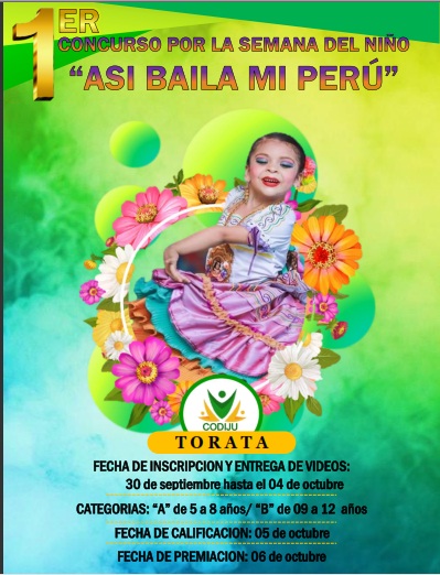 El Concejo Distrital de la Juventud CODIJU-Torata en coordinacion con el apoyo de la DEMUNA y la Municipalidad Distrital de Torata, invitan a participar del Concurso Distrital “Así baila mi Perú” por la Semana del Niño. 👧🧒