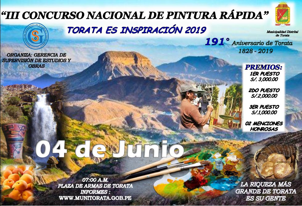 La Municipalidad Distrital De Torata a través de la Gerencia de Supervisión Estudios y Obras, en el marco de la celebración del 191° Aniversario de Torata, y dentro de sus funciones promueve y ejecuta la actividad III CONCURSO NACIONAL DE PINTURA RÁPIDA “TORATA ES INSPIRACIÓN” con la finalidad de promover y difundir por medio de la pintura los atractivos turísticos, las costumbres, historia e identidad local, revalorando el patrimonio cultural del Distrito de Torata.