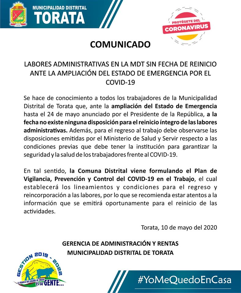 Se hace de conocimiento a todos los trabajadores de la Municipalidad Distrital de Torata que, ante la ampliación del Estado de Emergencia hasta el 24 de mayo anunciado por el Presidente de la República, a la fecha no existe ninguna disposición para el reinicio íntegro de las labores administrativas. Además, para el regreso al trabajo debe observarse las disposiciones emitidas por el Ministerio de Salud y Servir respecto a las condiciones previas que debe tener la institución para garantizar la seguridad y la salud de los trabajadores frente al COVID-19.
