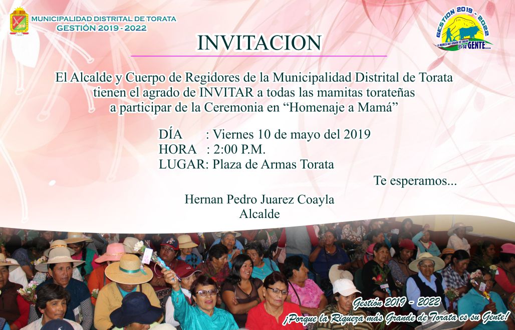 El Alcalde y Cuerpo de Regidores de la Municipalidad Distrital de Torata tienen el agrado de INVITAR a todas las mamitas torateñas a participar de la Ceremonia en “Homenaje a Mamá”