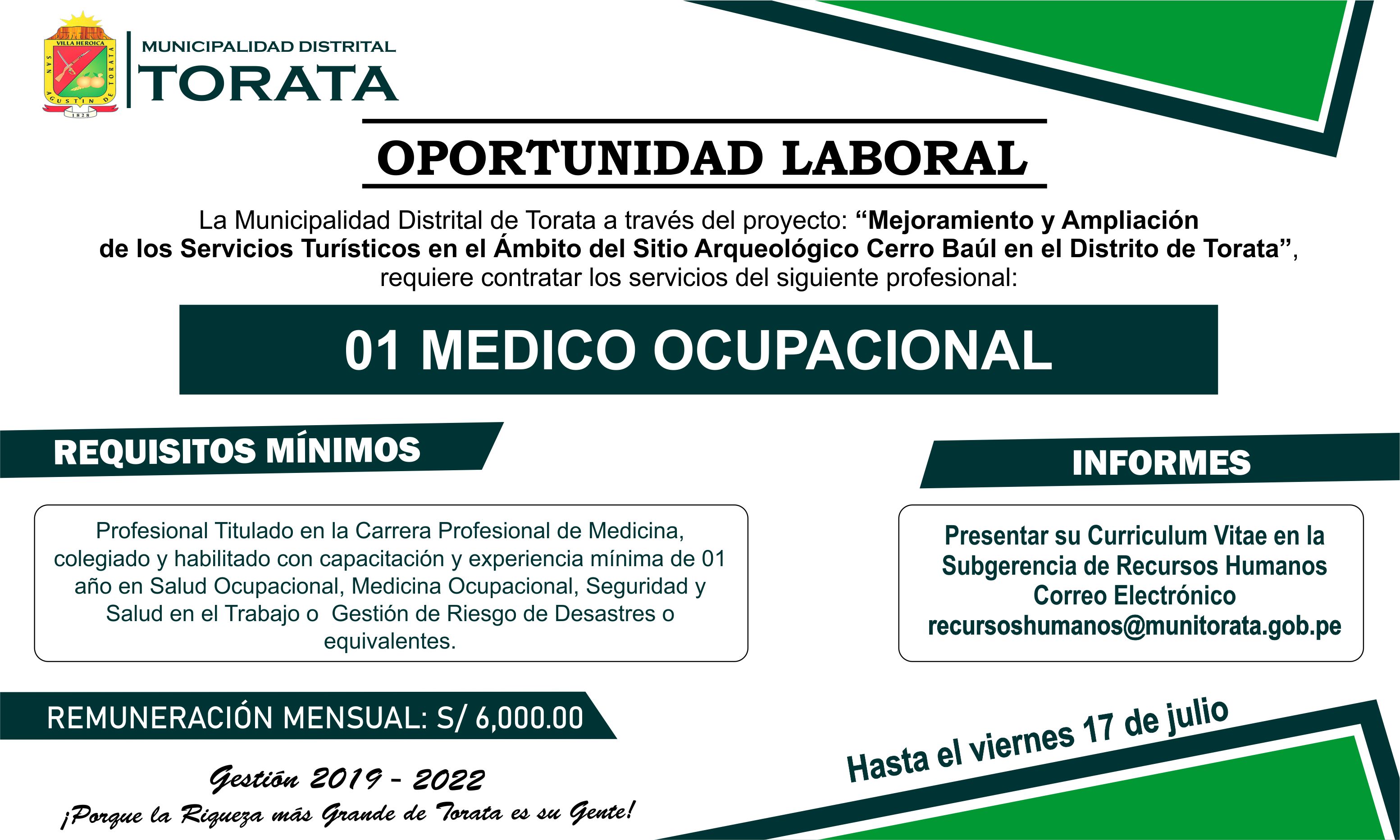 MUNICIPALIDAD DE TORATA REQUIERE CONTRATAR LOS SERVICIOS DE UN MEDICO OCUPACIONAL