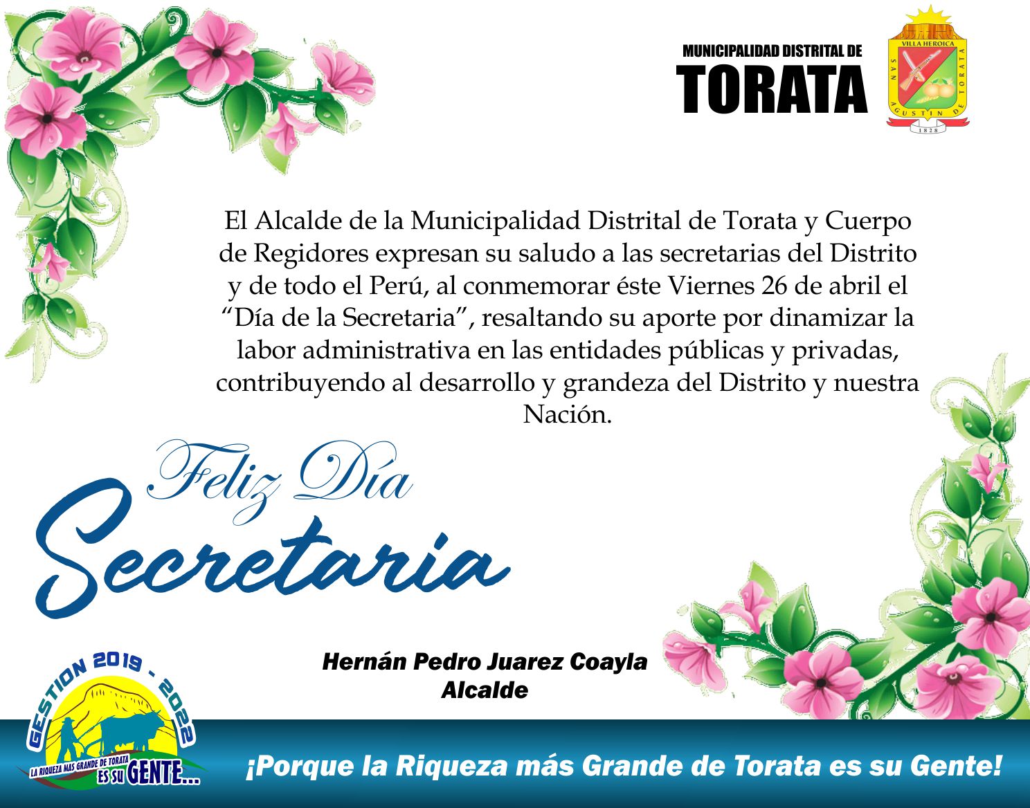 El Alcalde de la Municipalidad Distrital de Torata y Cuerpo de Regidores expresan su saludo a las secretarias del Distrito y de todo el Perú, al conmemorar éste Viernes 26 de abril el “Día de la Secretaria”, resaltando su aporte por dinamizar la labor administrativa en las entidades públicas y privadas, contribuyendo al desarrollo y grandeza del Distrito y nuestra Nación.